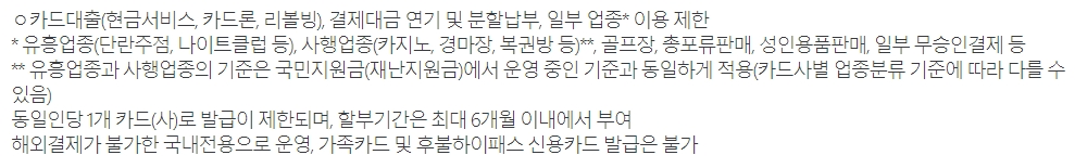 장단기 카드대출(카드론, 현금서비스), 할부기간 제한(최대 6개월), 유흥·사행업종 등 일부 항목에서 이용이 제한된다.