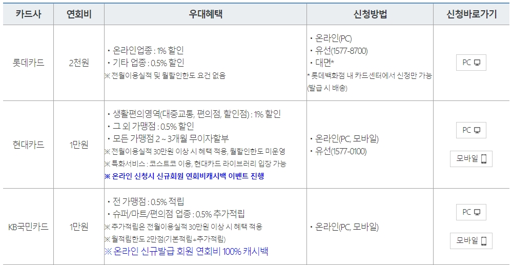 카드사별 연회비 및 혜택 등을 비교 후에 본인에게 가장 유리한 카드사에 카드(최대 1개)를 신청하기 바랍니다.