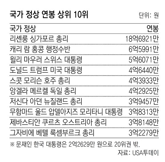세계에서 가장 많은 연봉을 받는 국가 정상은 (2019년기준)