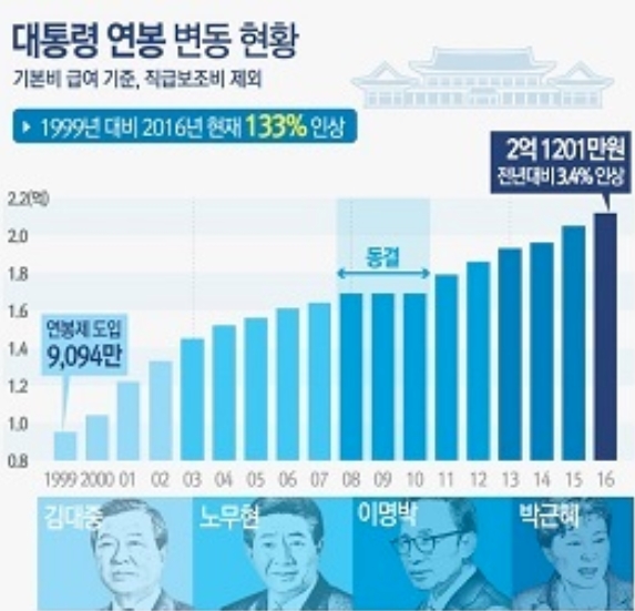 노무현 대통령의 최종 연봉은 1억7000여만원이었고, 이명박 전 대통령은 1억8000만원 후반대였다.