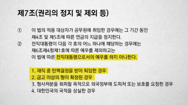 따라서 징역형이 확정된 전두환·노태우·이명박·박근혜 전 대통령은 연금을 수령하지 못한다.